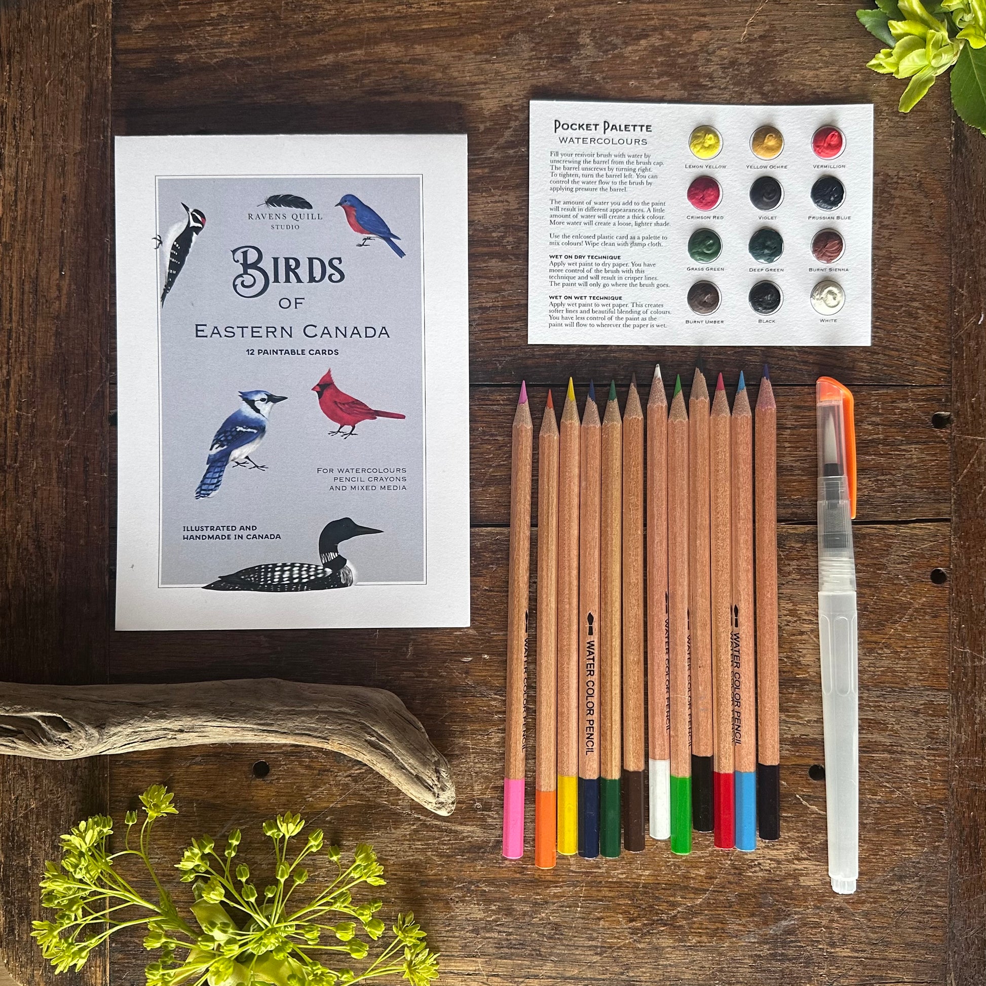 Choose between purchasing the card set by itself or throwing in a Pocket Palette of Watercolours or Watercolour Pencils, both of which come with a nifty brush equipped with a water reservoir! Or, you could get the Whole Kit and Caboodle and add both to your collection!