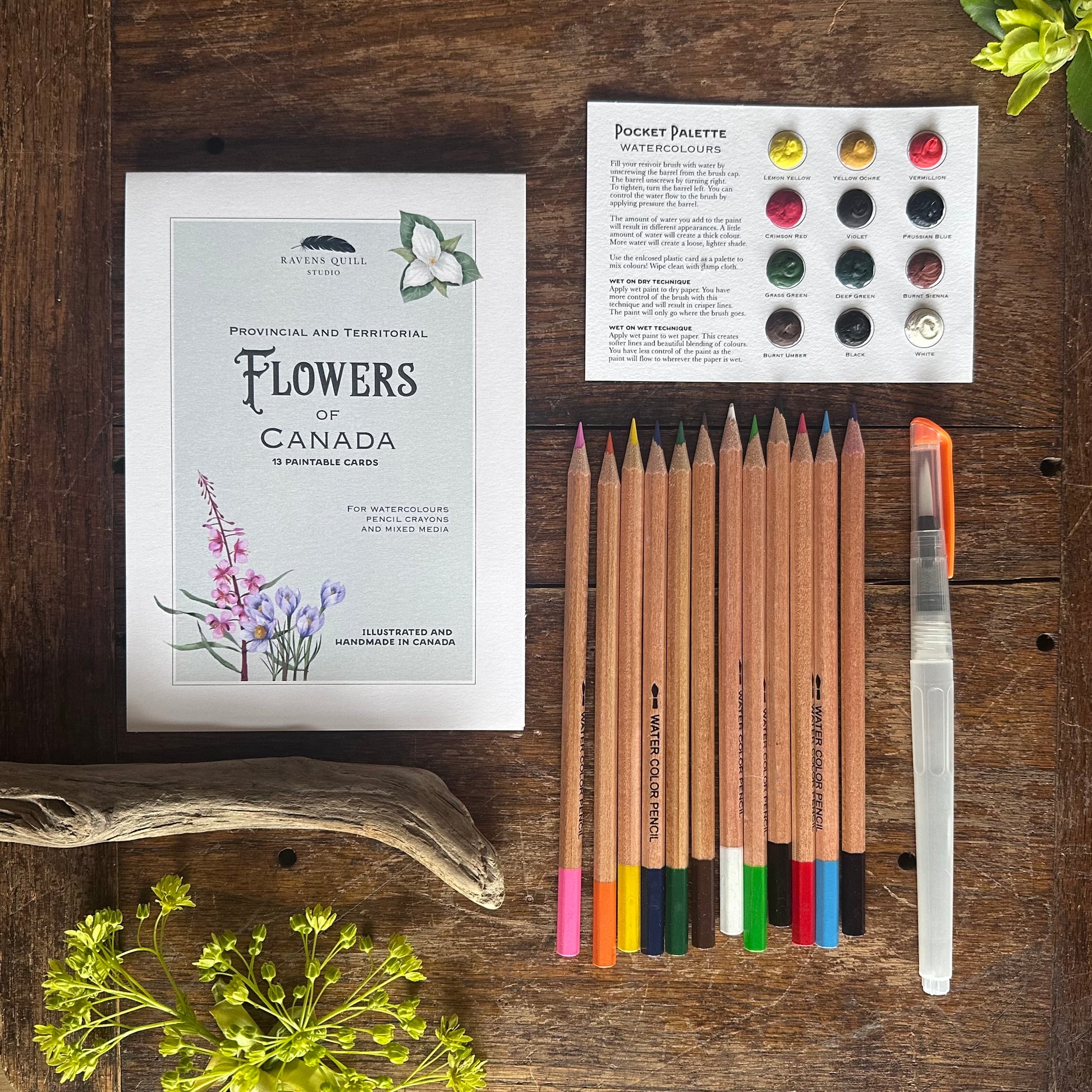 Choose between purchasing the card set by itself or throwing in a Pocket Palette of Watercolours or Watercolour Pencils, both of which come with a nifty brush equipped with a water reservoir! Or, you could get the Whole Kit and Caboodle and add both to your collection!