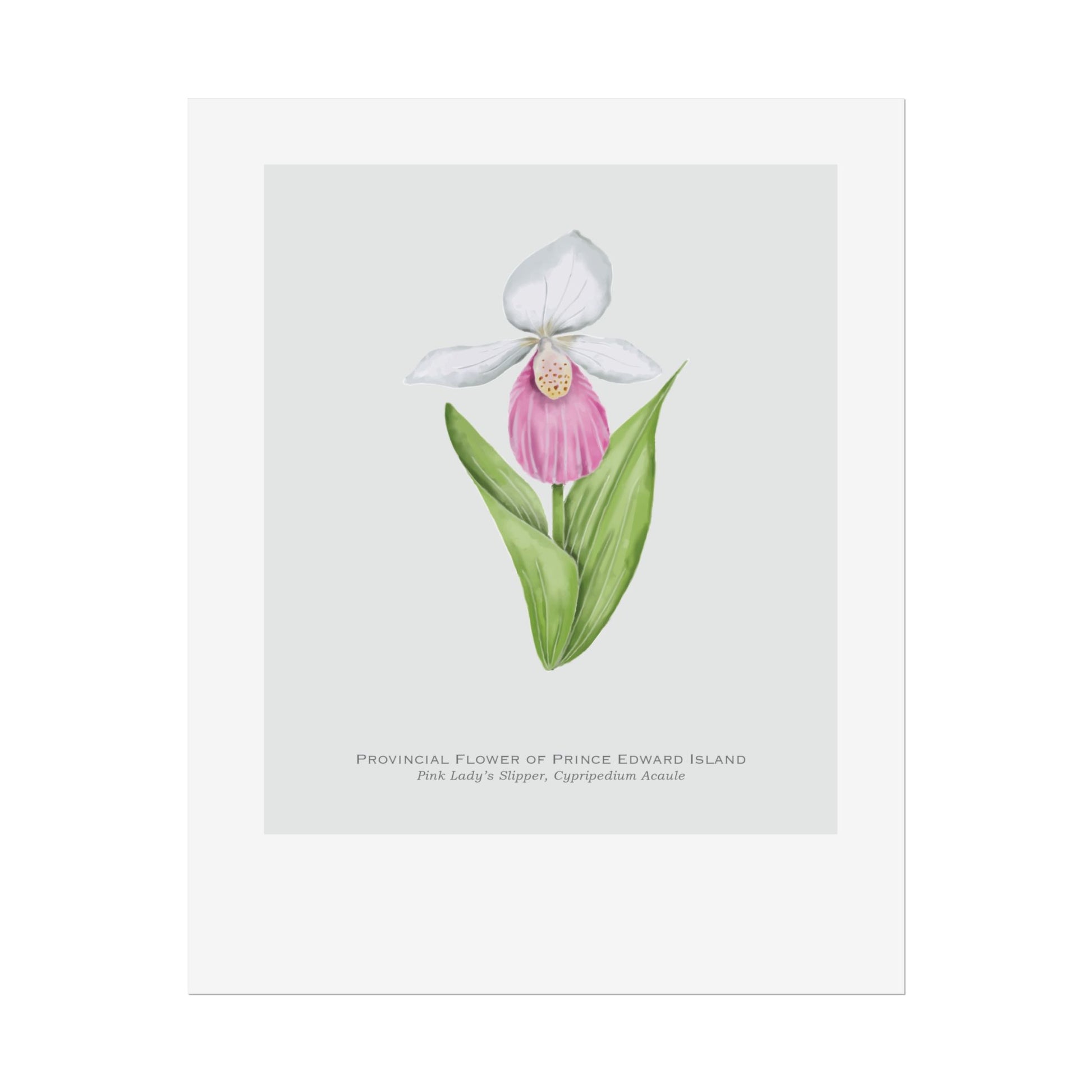 This print features a beautiful illustration of the provincial of Prince Edward Island, the pink lady's slipper. Perfect for botanical enthusiasts and those who appreciate floral designs. Ideal for home decor, office spaces, or as a gift for nature lovers.