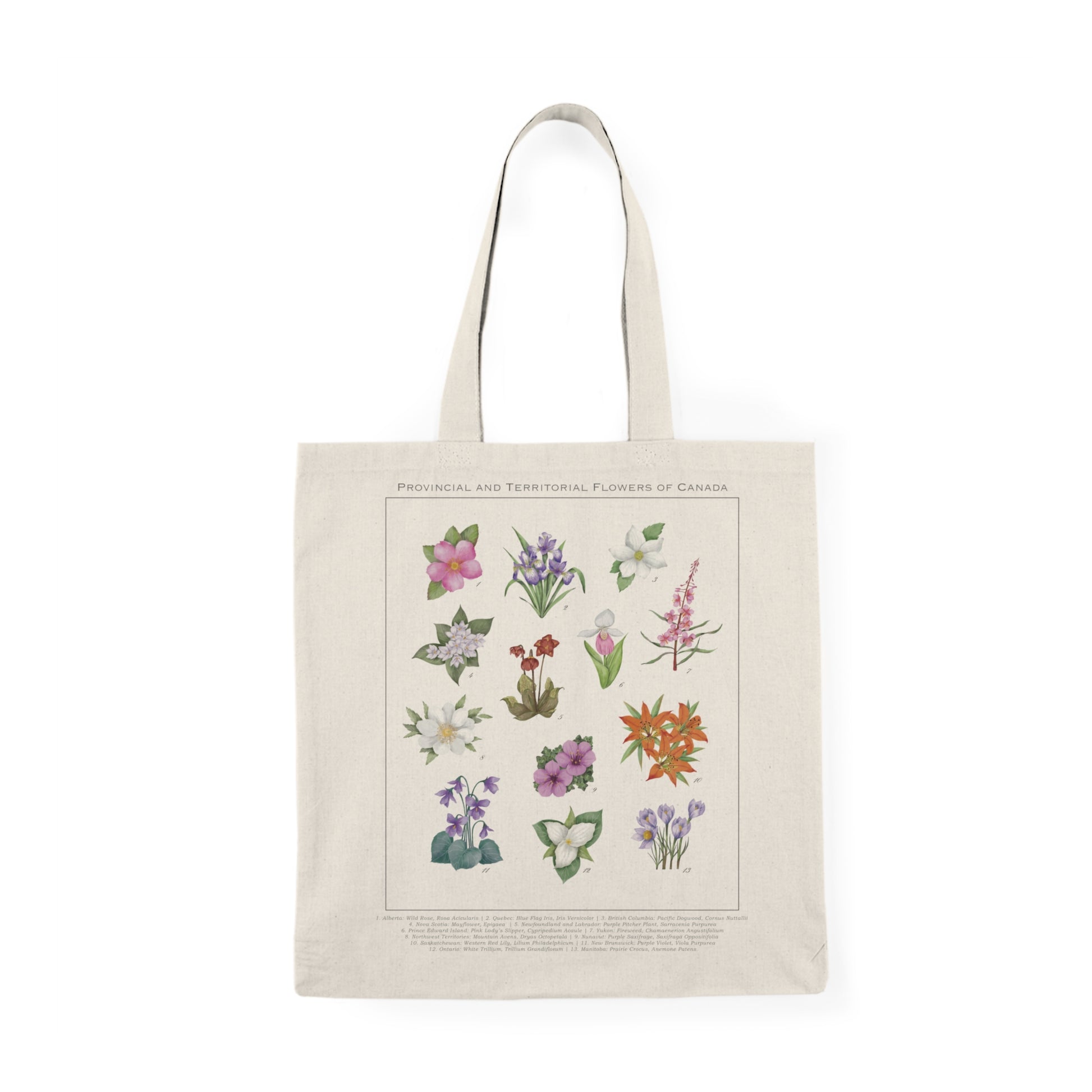 Introducing our trendy Tote Bag, showcasing hand-drawn depictions of Canada's Provincial and Territorial flowers - ideal for your daily errands!Made from 100% natural cotton canvas, this tote embodies an eco-friendly choice for those who love both style and sustainability.Ā